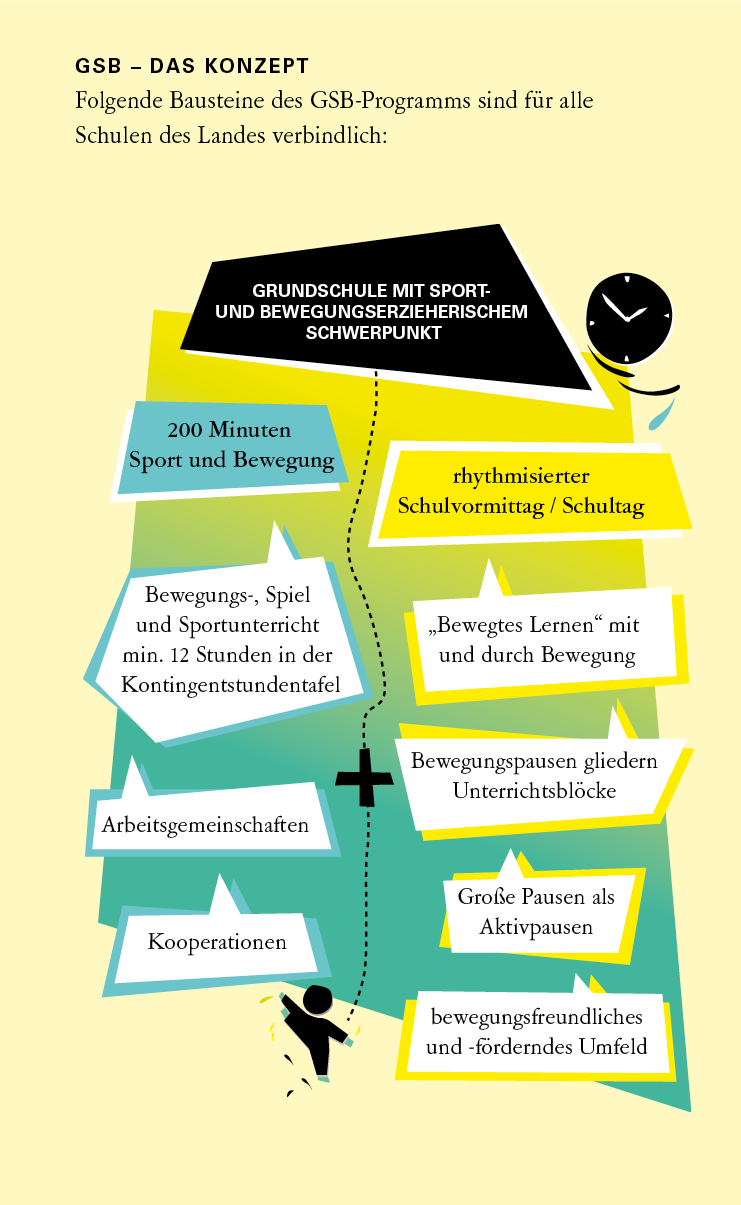 Die gemeinsame Umsetzung einer Schule mit sport- und bewegungserzieherischem Schwerpunkt ist immer eine gemeinsame Aufgabe aller Lehrkräfte einer Schule. Die Bausteine des GSB-Programms sind für alle Schulen des Landes verbindlich. Diese umfassen den Unterricht, den rhythmisierten Schultag sowie die außerunterrichtlichen Bewegungs-, Spiel- und Sportangebote.